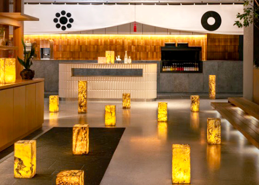 裏面照射技術を採用することで石材の自然な模様と光が織りなす、幻想的な空間が演出されます。